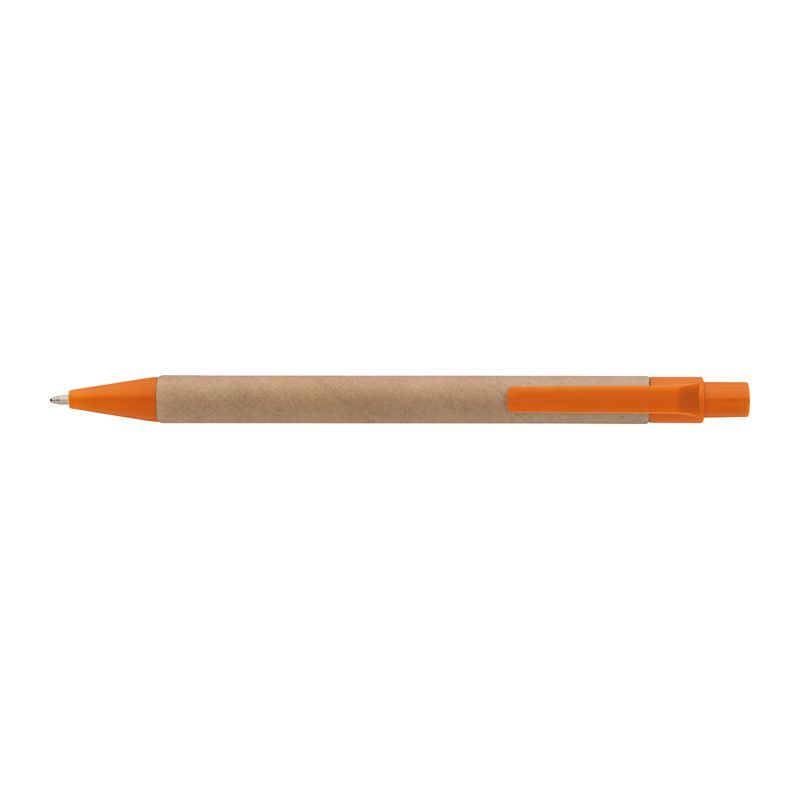 ЕКО химикалка, изработена от рециклирана хартия и цветни пластмасови апликации със син пълнител за писане.