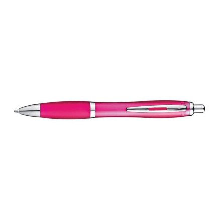 Прозрачна пластмасова химикалка с ергономична зона за захващане и голям син пълнител за писане.