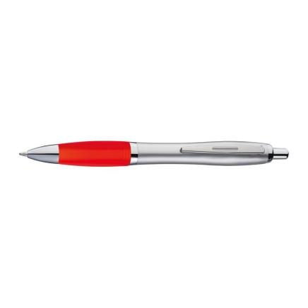 Пластмасова химикалка с голям син пълнител за писане и цветна офсетна зона за захващане.