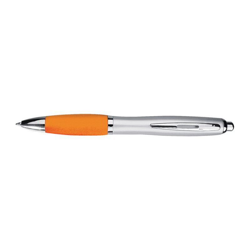 Пластмасова химикалка с голям син пълнител за писане и цветна офсетна зона за захващане.