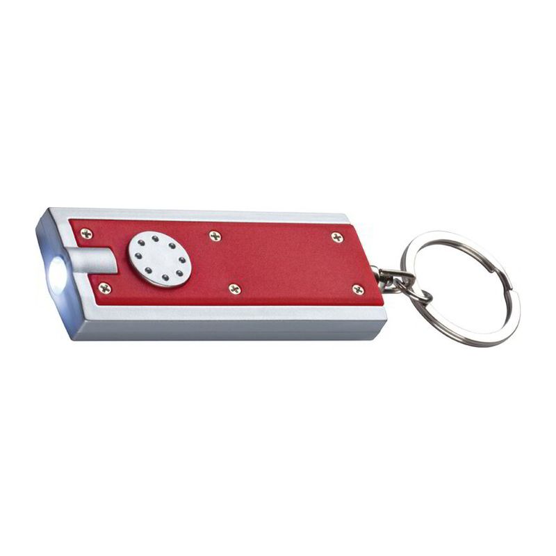 Плосък и правоъгълен ключодържател с модерен дизайн и LED светлина. Ключодържателят е пластмасов, в комплекта има две батерии.