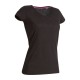 ТЕНИСКА MEGAN с V-образно деколте, изработена от 100% пръстенопреден пениран памук, единично трико (GYH: 85% памук, 15% вискоза), странични шевове, модерна дължина, контрастна лента на врата.
