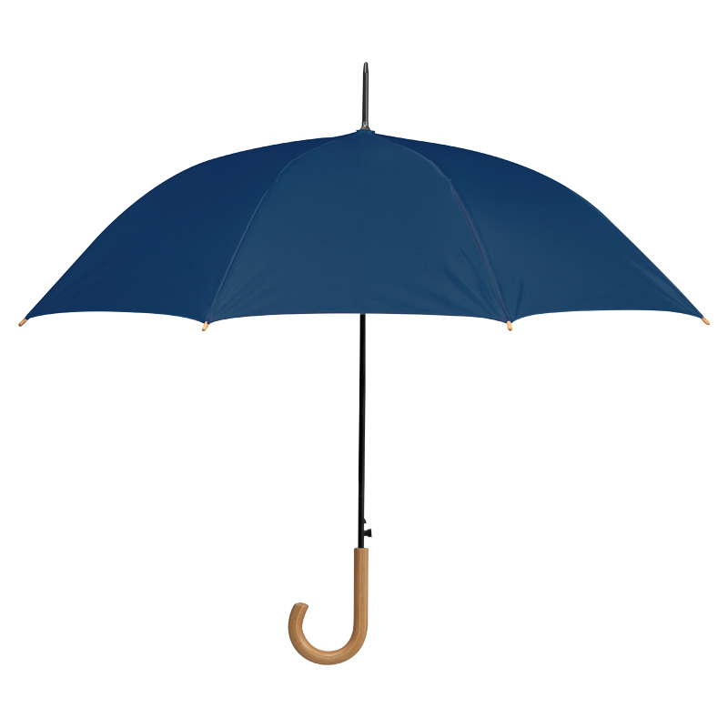 Автоматичен чадър, изработен от 190T полиестер с извита дървена дръжка и дървени накрайници.