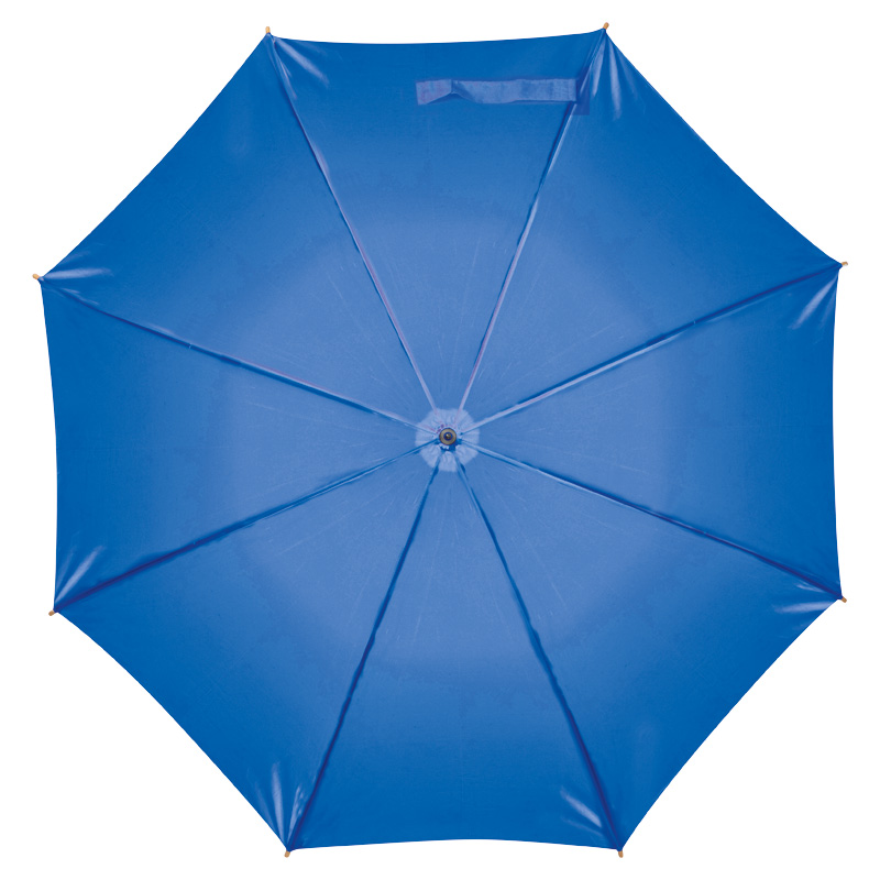 Автоматичен чадър, изработен от 190T полиестер с извита дървена дръжка и дървени накрайници.