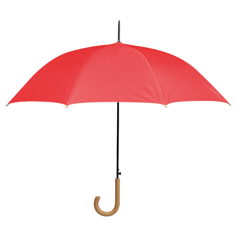 Автоматичен чадър, изработен от 190T полиестер с извита дървена дръжка и дървени накрайници.