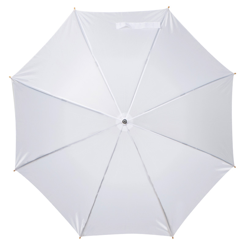 Автоматичен чадър, изработен от 190T полиестер с извита дървена дръжка и дървени накрайници.
