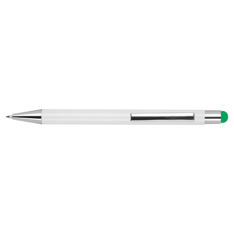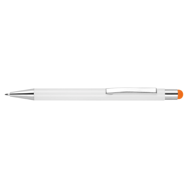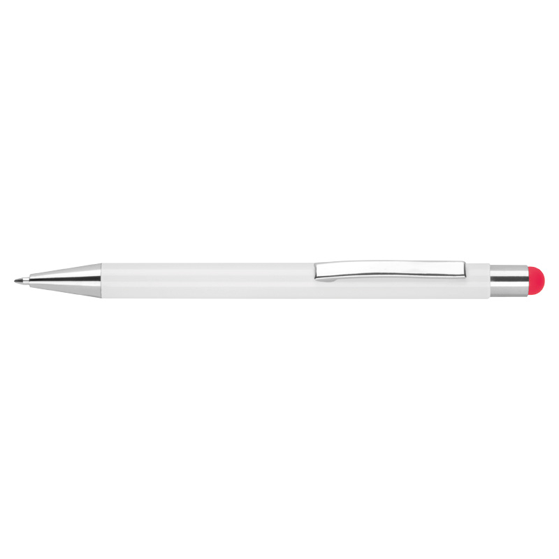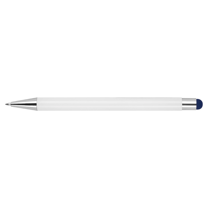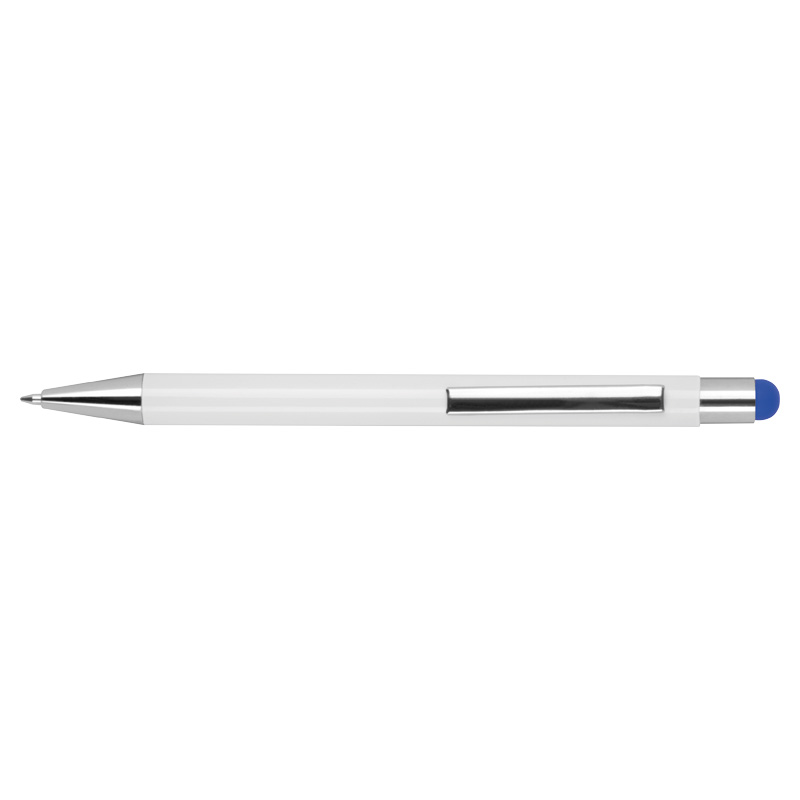 Алуминиева химикалка със сребристи апликации, сензорна функция и син пълнител за писане. Вашето лого ще бъде отпечатано отдясно на клипса.