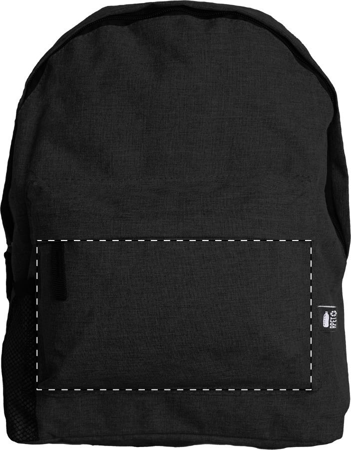 Раница с преден джоб с цип, мрежест страничен джоб, подплатен гръб и презрамки. 600D RPET полиестер. С отличителен етикет RPET.