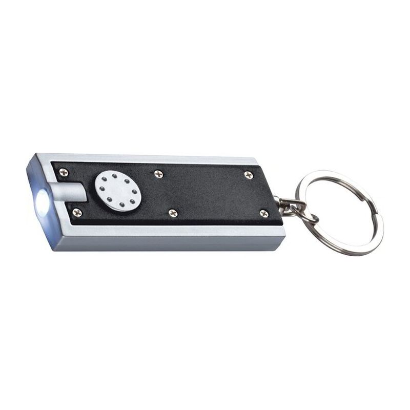 Flat and rectangular keychain in a modern design and with LED light. The key ring is made of plastic, two batteries are included.
