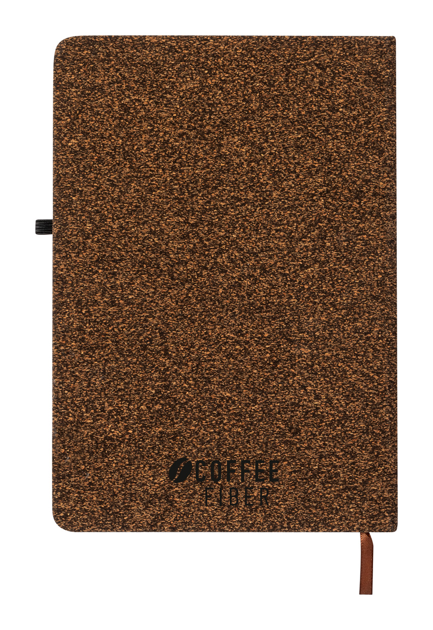 Coffee fibre and natural cork covered notebook with 80 lined sheets in recycled kraft paper and pen holder. A5 size.