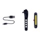 ABS plastic bicycle light with high power COB floodlight (white and red light), built-in USB rechargeable battery (500 mAh) and elastic strap. With fixed and flashing light modes. Including USB charger cable.