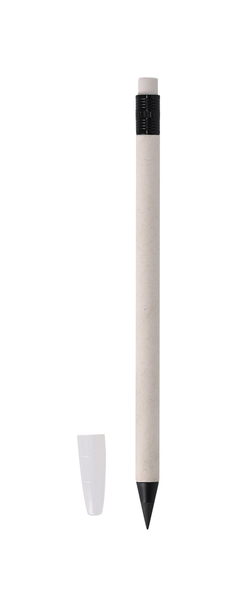 Long-lasting inkless pen in recycled milk carton paper with eraser and metal alloy tip, which oxidizes the paper. This pen writes similarly to a pencil, and it is also erasable.