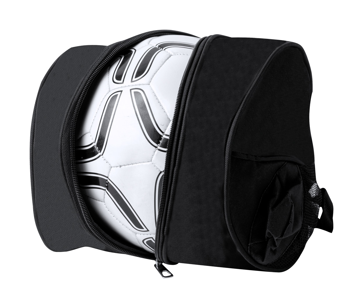 Zipped ball carrier bag in 600D RPET polyester with bottle holder mesh pocket and adjustable shoulder strap. Delivered without ball.