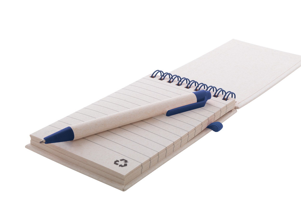 | Description | Recycled milk carton paper spiral notebook with hard cover and 70 lined sheets. With matching colour spiral rings, rubber strap and pen holder. Including recycled milk carton paper and recycled ABS plastic ballpoint pen with blue refill. A6 size. |