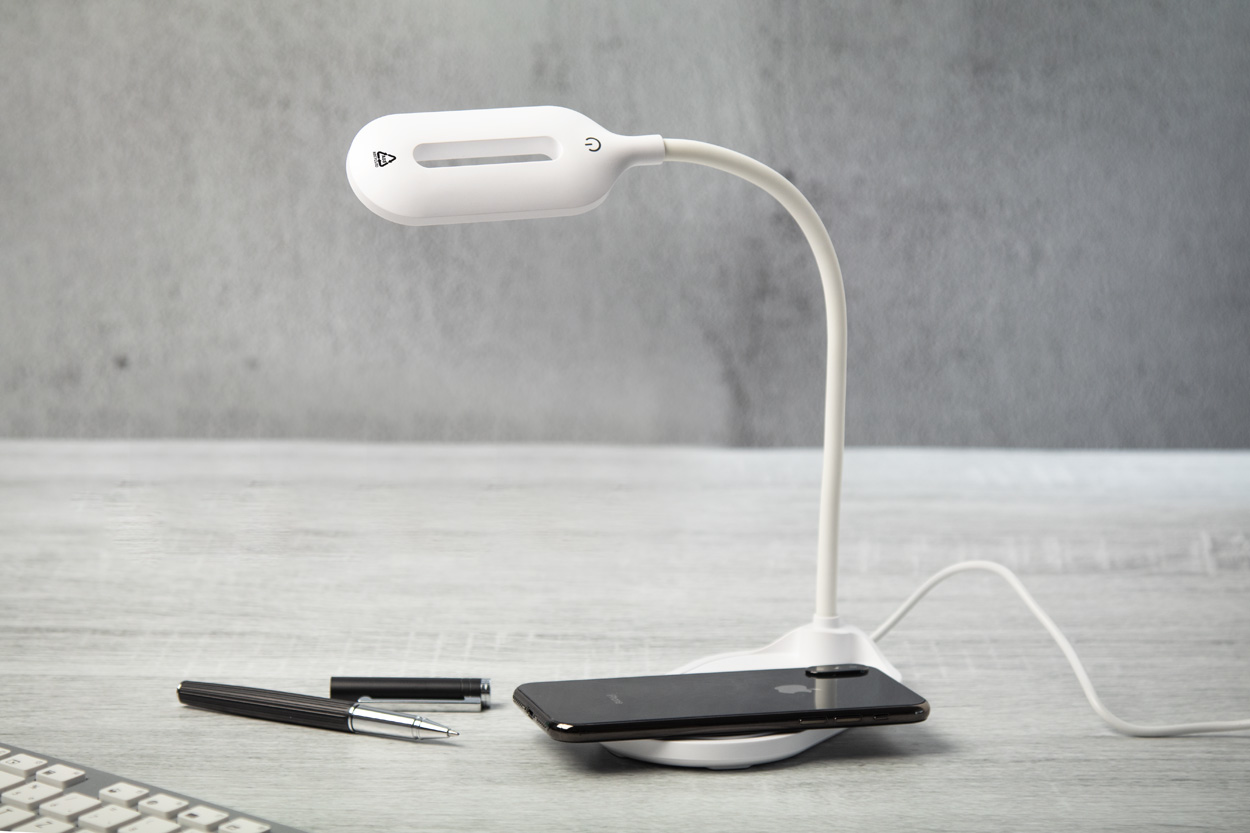 Recycled ABS multifunctional desk lamp with built-in wireless fast charger (15W). With 10 LEDs, touch sensitive button and adjustable brightness. Including USB charger cable.