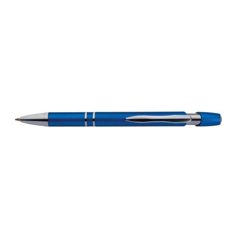 Пластмасова химикалка с метален външен вид, голям капацитет на пълнителя и функция за натискане.