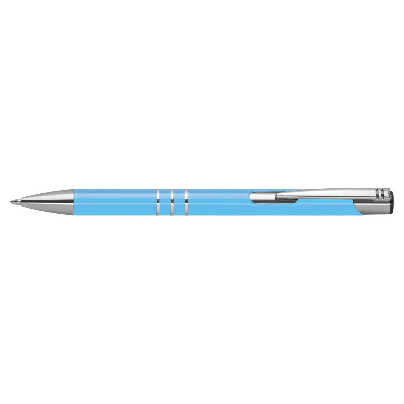 Изцяло лакирана метална химикалка с 3 декоративни пръстена и син пълнител за писане с голям капацитет.