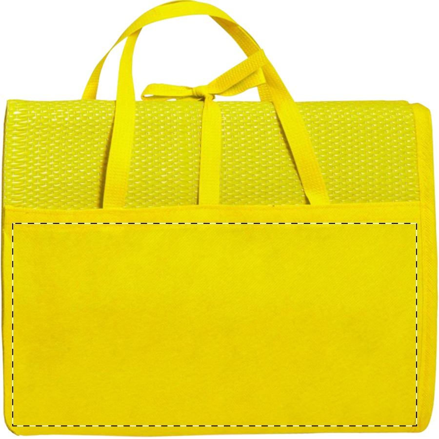 Плетена пластмасова плажна постелка с дръжки за носене.