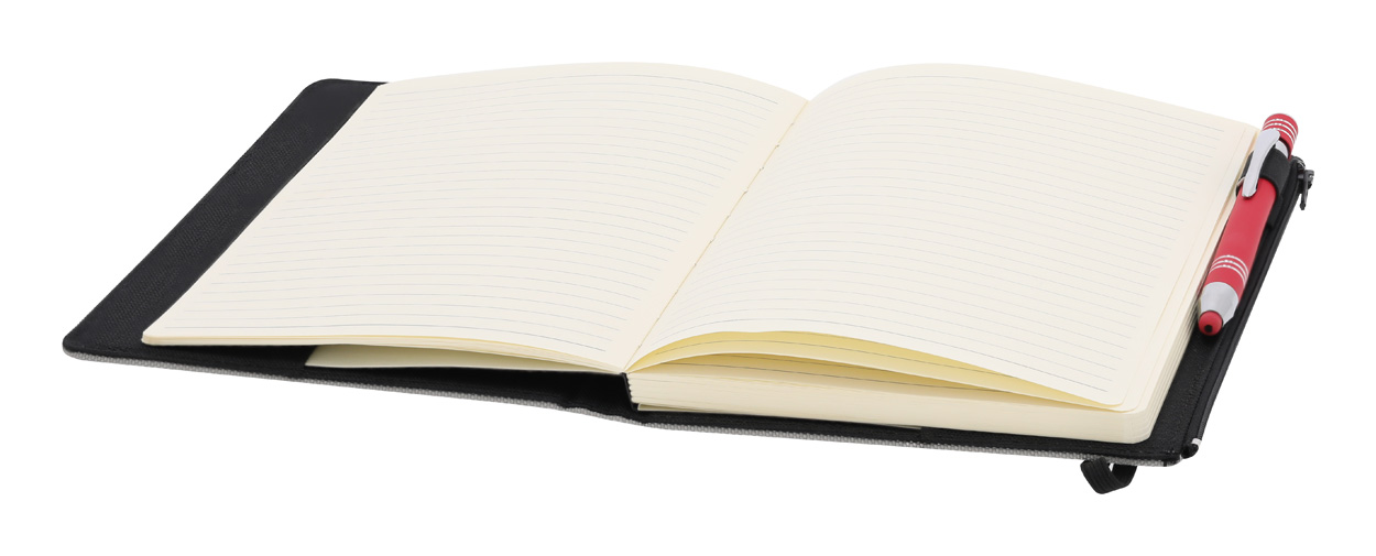 600D RPET polyester covered notebook with zipped pocket, rubber band and 100 lined sheets. A5 size.