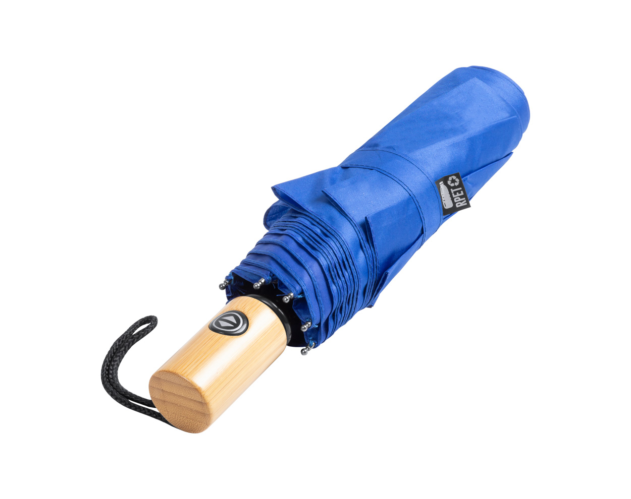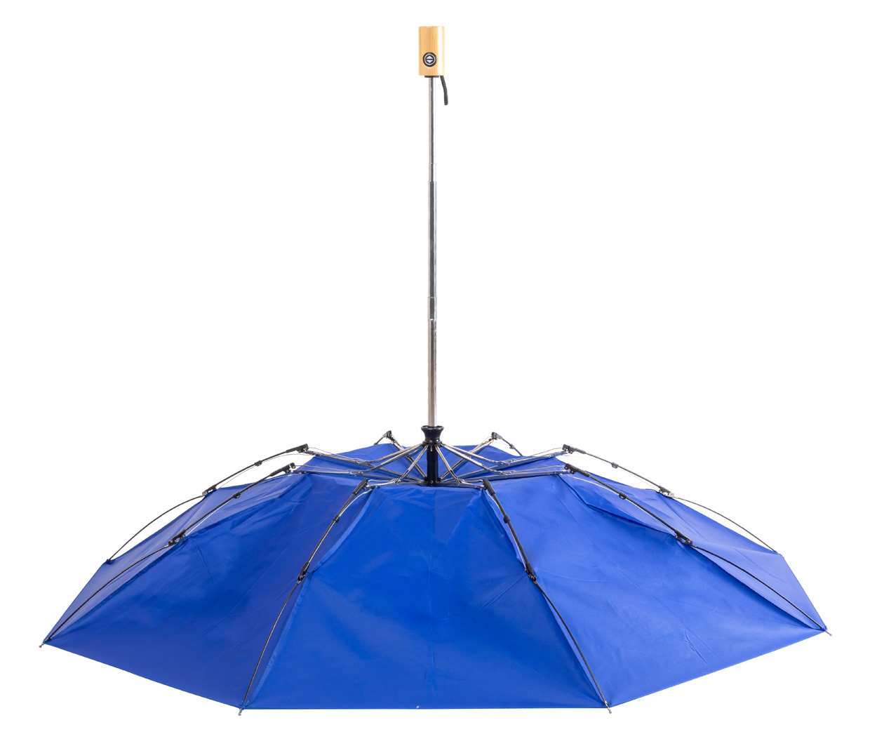 Напълно автоматичен (отворен/затворен), ветроустойчив сгъваем чадър с 8 панела в торбичка в съвпадащ цвят. С метална рамка и бамбукова дръжка. 190T RPET понге. С отличителен етикет RPET.