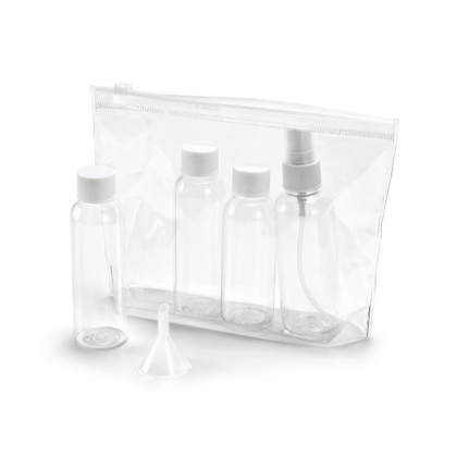 Херметична козметична чантичка. Изработена от PVC. Включва 3 шишета - 2 по 65 мл и 1 60 мл, пулвелизатор 80 мл и фунийка.