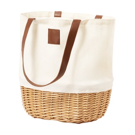 Cotton and wicker picnic basket for 2 people, with PU leather shoulder straps. Including 12 pc tableware set.