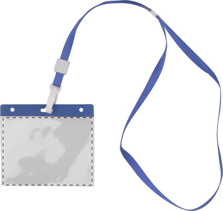 Полиестерен ремък с пластмасов карабинер и PVC държач за бадж.