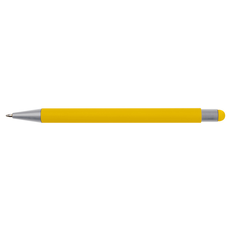 Метална химикалка със стилус за работа със смартфони и таблети, цветна гумирана повърхност и син пълнител за писане.