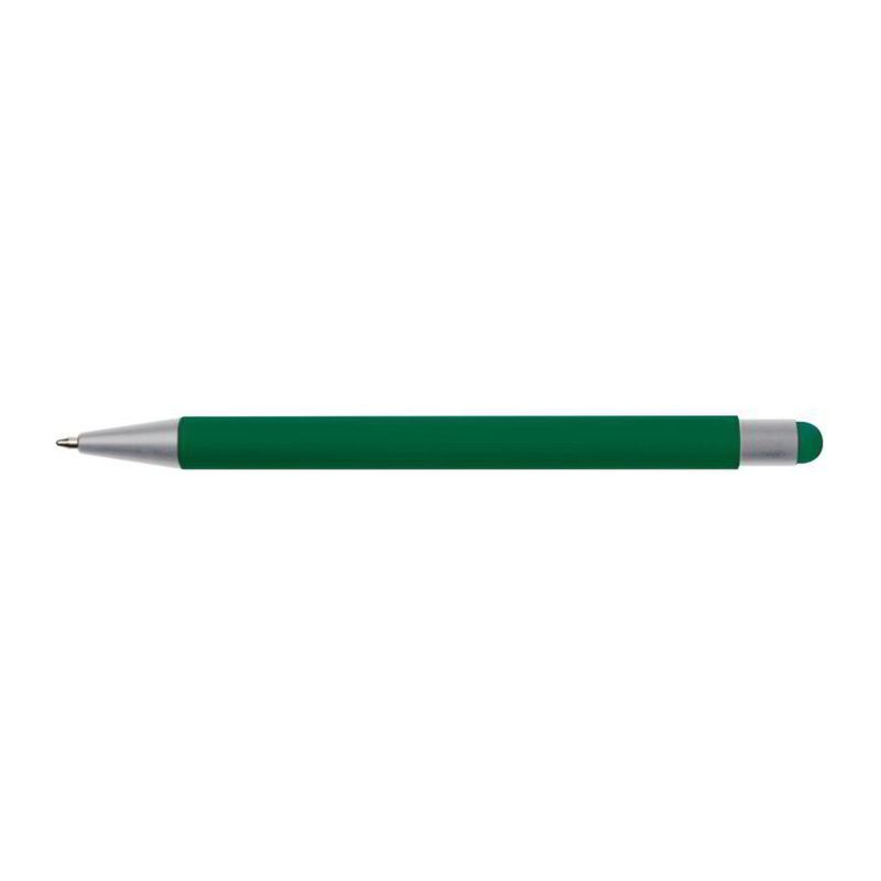 Метална химикалка със стилус за работа със смартфони и таблети, цветна гумирана повърхност и син пълнител за писане.