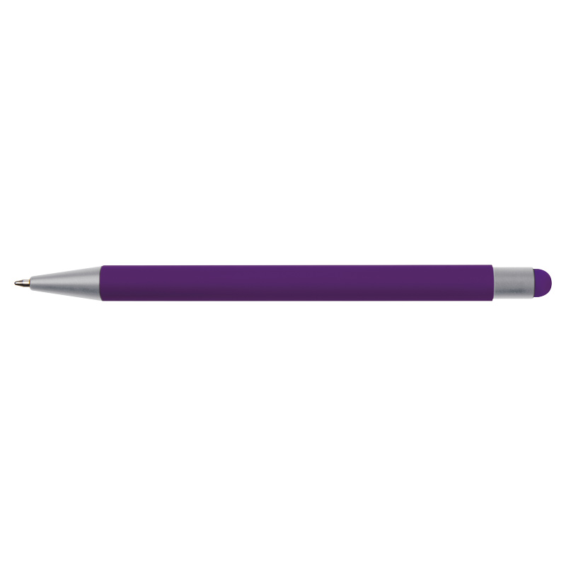 Метална химикалка със стилус за работа със смартфони и таблети, цветна гумирана повърхност и син пълнител за писане.