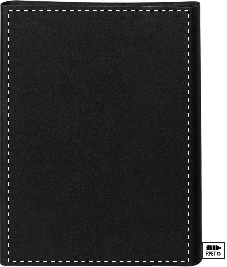 Полиестерна папка за документи с размер A4 600D RPET с магнитно затваряне, сгъваем мобилен държач и бележник за 20 листа. С отличителен етикет RPET.