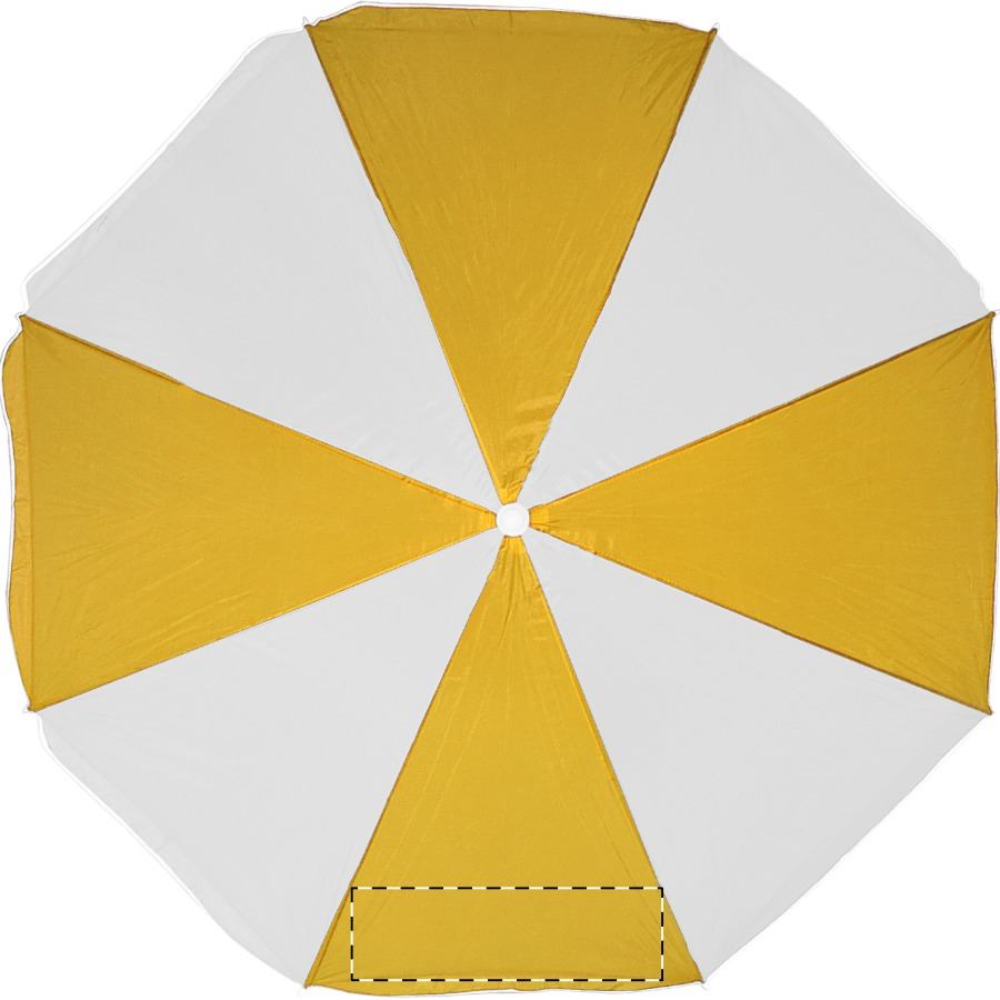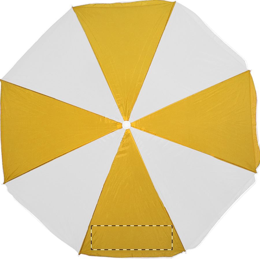Двуцветен плажен чадър с регулируема на височина метална рамка и 8 панела от найлон. С PVC чанта за носене.
