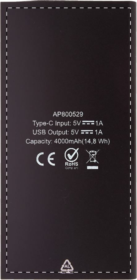 USB захранваща банка в корпус от рециклиран алуминий с вградено соларно зарядно устройство и 4000 mAh батерия. С 2 USB и 1 USB-C портове за зарядно устройство. USB-C входен порт. Включително USB кабел за зареждане.