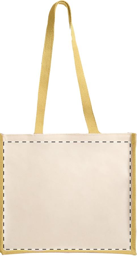 | Описание | Shopping bag in combination of laminated jute and laminated cotton with long handles. |